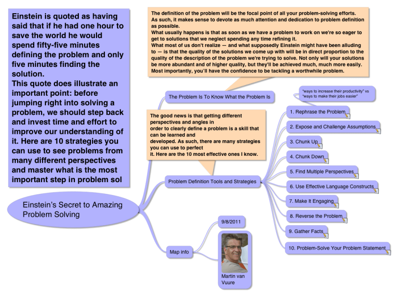 - Einstein is quoted as having said that if he had one hour to save the world he would spend fifty-five minutes defining the problem and only five minutes finding the solution. This quote does illustrate an important point: before jumping right into solving a problem, we should step back and invest time and effort to improve our understanding of it. Here are 10 strategies you can use to see problems from many different perspectives and master what is the most important step in problem solving: clearly defining the problem in the first place!