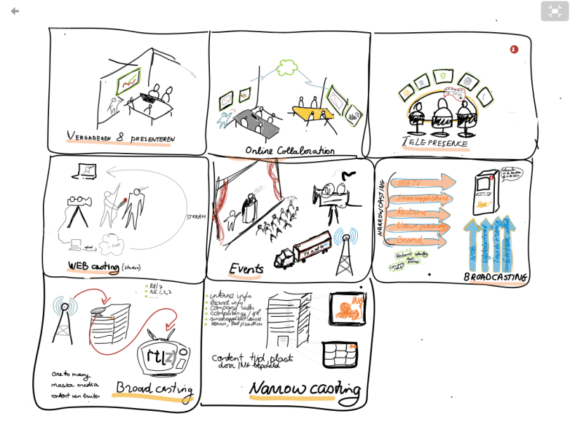 - Online collaboration (OC): Vergaderen en presenteren aangevuld met opname faciliteiten en een verbinding tussen 2 of meer locaties met als doel op de locaties een overleg met elkaar te kunnen houden en audio/visueel informatie te kunnen delen (zie bijlage). Teleprsence is de luxe vorm van VC, voornamelijk voor continue gebruik met name internationaal.