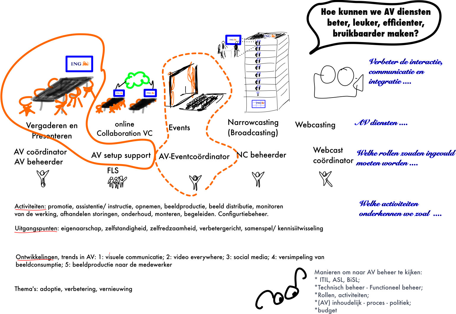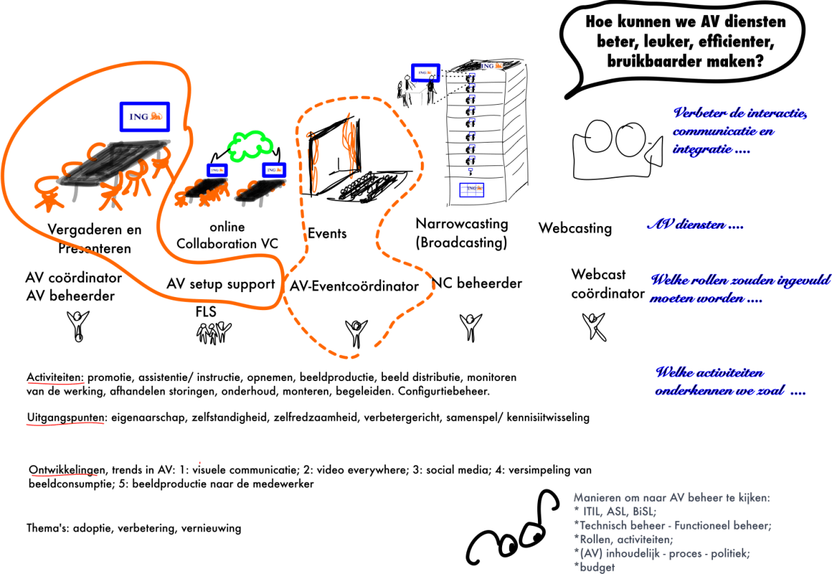 In het speelveld van audio-visuele sericeketens zijn tal van verbeteringen mogelijk. Het helder maken van verantwoordelijkheden, delen van expertises, overdraagbaar maken van kennis, het acteren op nieuwe ontwikkelingen, maar ook het inrichten van de adaptatie en eenvoudige gebruikersinstructies zijn een aantal zaken die momenteel achterblijven en daarmee het daadwerkelijke gebruik van A/V faciliteiten in de weg zit.