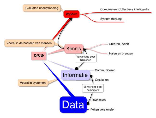 Tot slot, last nut not least, het DIKW model. Wat mij betreft kun je wijsheid weglaten en vervangen door waarde. Wijsheid klinkt mij als iets superieurs, wat mij betreft te weinig tastbaar. Waarde dekt meer de lading.