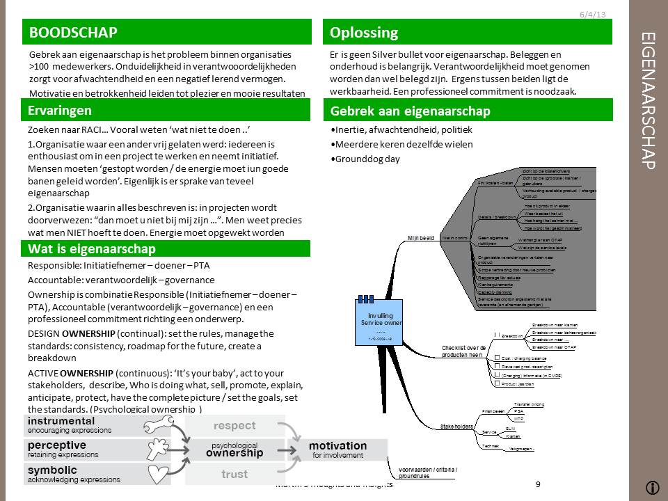 Ownership leidt in principe tot ‘positive organisational behaviour'(intrinsieke motivatie, professionele ontwikkeling, commitment ad organisatie, zichzelf zichtbaar maken, informeel zeggenschap) maar kan doorslaan in teritorium gedrag en weerstand tegen verandering. Een gedeeld ownership heeft de voorkeur, waarbij gedeeld, wat mij betreft, een combi is van bottum-up en top-down of vanuit de andere ‘niveaus.