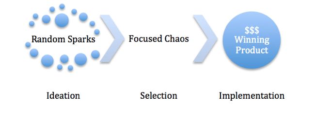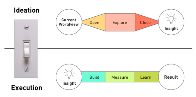 Ideation gaat in eerste instantie om het genereren van veel ideeën om uiteindelijk enkele goed te kleuren. Het gaat om ingevingen , hunches.