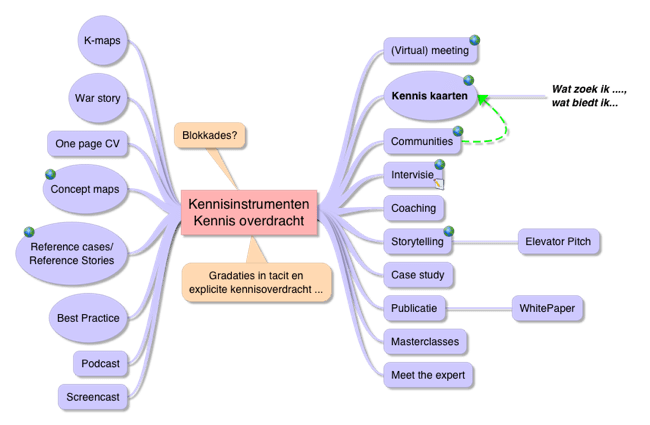 Er zijn tal van kennisinstrumenten te onderkennen, van webinar tot filmpje, van podcast tot infographic, van kenniskaart tot reference case. Van Podcast tot visual. Van community tot lunchsessie, maar ook van virtual meeting tot google-hangout of van community tot kenniskring. Ook mindmaps, Kanban-boards als Trello worden meer en meer bruikbaar om informatie en wellicht kennis en/of wijsheid te delen.