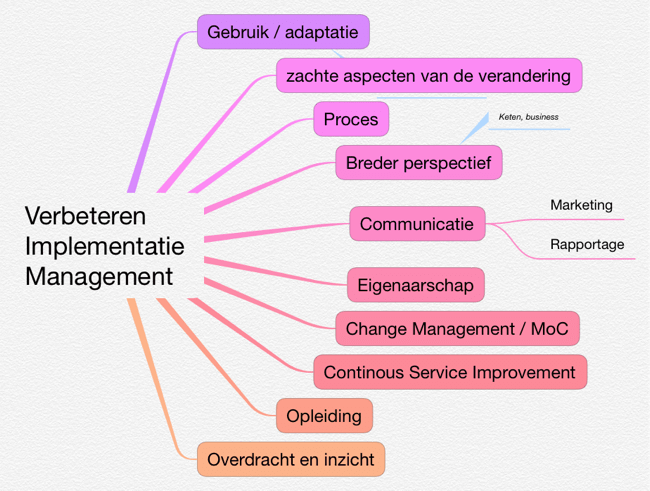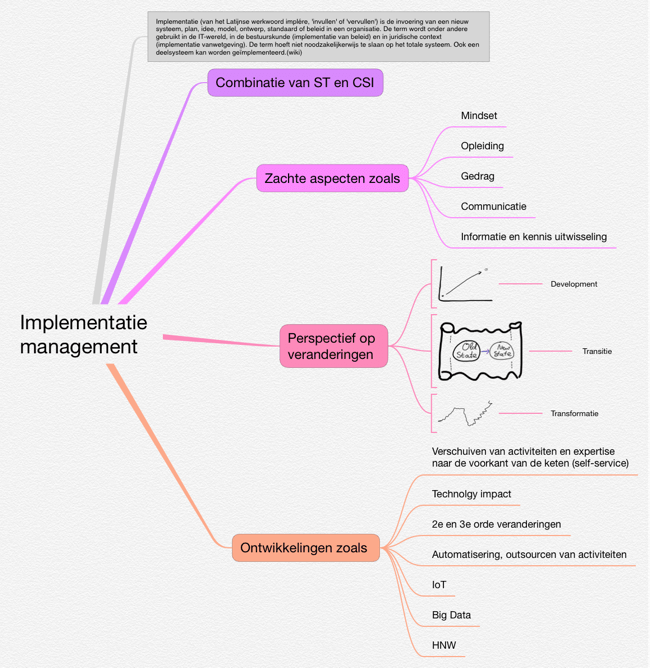 Veranderingen vergen naast technische/inhoudelijke aspecten, zoals de invoering van een nieuwe applicatie of desktop, ook aanpassingen in zachtere aspecten zoals in manier van (samen)werken, mindset, communicatie, businessmodel, eigenaarschap, adaptatie en opleiding. Dit is het werkgebied van Implementatie-Management (IM) zie ook https://martinvanvuure.wordpress.com/2015/07/23/het-speelveld-van-implementatie-management/