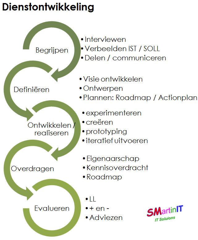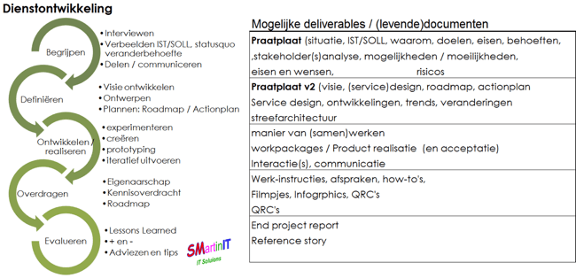Dienstontwikkeling heeft zowel ontwerp-activiteiten (met name binnen het project/ de leverancier, ‘waterval-achtig’) en ontwikkel-activiteiten (met name met de omgeving, ‘agile’). Iteraties van verbeteringen zullen continue herhaald moeten blijven worden om de dienst levensvatbaar te houden (zie ook pendelen)