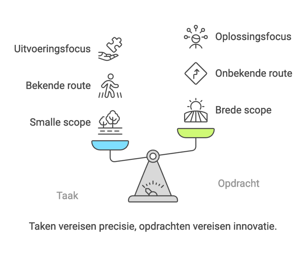 Hoe we iets noemen, maakt uit. Het woord opdracht nodigt uit tot denken, eigenaarschap, creativiteit. Het woord taakricht zich op uitvoering, helderheid, structuur. Allebei nodig, allebei waardevol — maar juist door het onderscheid te maken, kun je rollen, verwachtingen en samenwerking veel effectiever maken.
