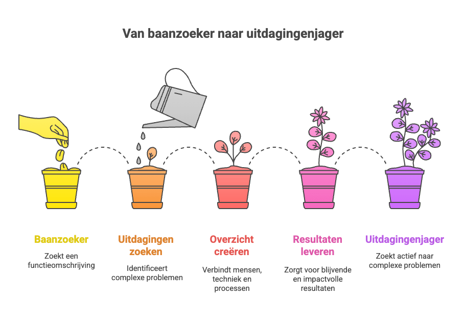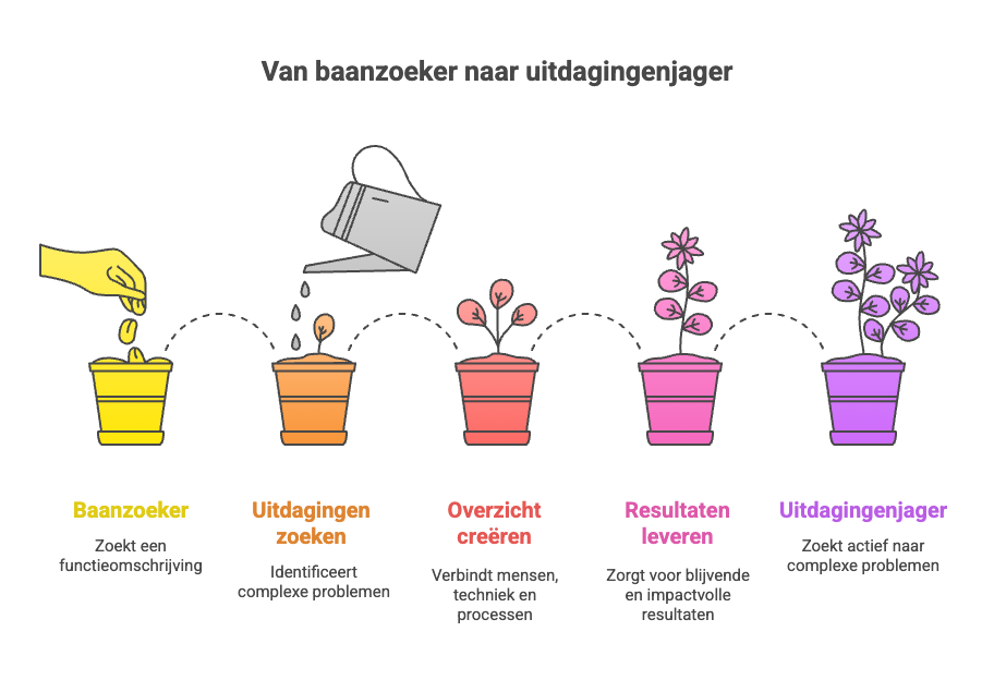 Ik ga actief op zoek naar deze uitdagingen – soms via vacatures, maar vaker via gesprekken. Want de mooiste uitdagingen staan vaak niet in een functieomschrijving, maar komen naar boven als je vraagt: “Waar lopen jullie nu écht op vast?”