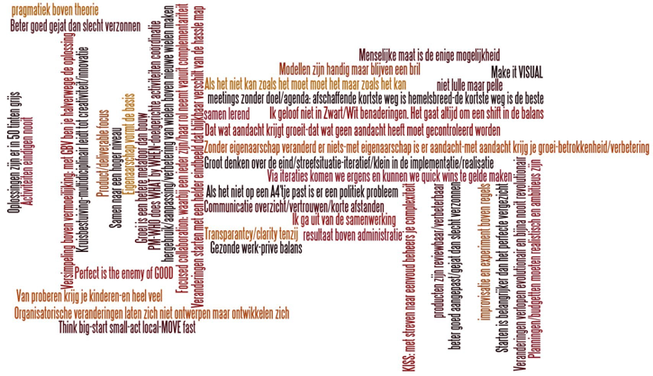 - Als het niet kan zoals het moet, moet het maar zoals het kan …: improvisatie en experiment boven regels; resultaat boven administratie; pragmatiek boven theorie. Modellen zijn handig maar blijven een bril. “niet lulle maar pelle”